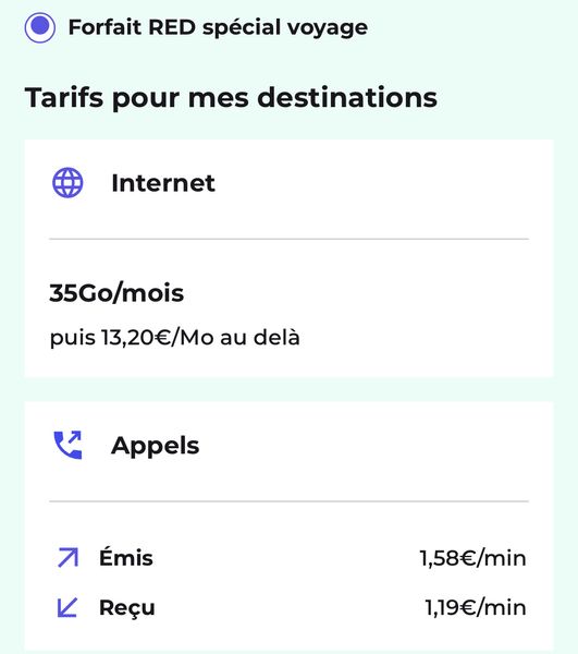 Si vous avez le forfait RED international (celui qui est actuellement proposé à tous les clients en changement d’offre à 19,99€/m) le coût d’un appel reçu reste inchangé (1,19€/min) en revanche aucun risque de hors forfait sur les données mobiles car ce forfait inclut 35Go depuis le Maroc puis est facturé 13,20€/Mo au-delà.